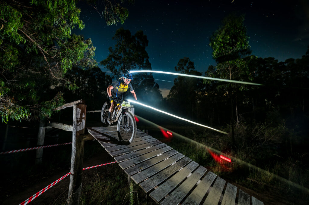 As the afternoon turned into evening, Dylan warned me that my lap times were significantly quicker than expected and suggested I slow down. I was confident that I was riding within my capabilities, however, so I kept fuelling and kept riding at the same consistent pace. Out on the trails, I enjoyed the company of possums, bandicoots, kangaroos, a rufous bettong, and two phascogales through the night. There are benefits to riding in a wildlife refuge! Returning to pit lane each lap, I was boosted by multiple calls of “Go Emma!” as I made my way to Dylan and then back out again. I also got to enjoy riding with Corinne Dolan, one of the roving medics on course, and together we timed the sunrise lap perfectly: hitting the top of Plane Sailing with the plane wreck lit up by party lights and then riding eastward as golden sunlight emerged from behind the horizon.